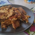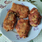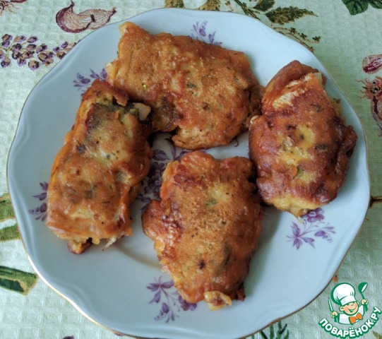 Соединить яйцо, все специи, нарезанную петрушку, выдавленный через пресс чеснок с мукой. Добавьте полстакана воды. Возможно вам понадобиться больше или меньше муки, все зависит от её качества и клейковины. Кляр должен получиться, как магазинная сметана.