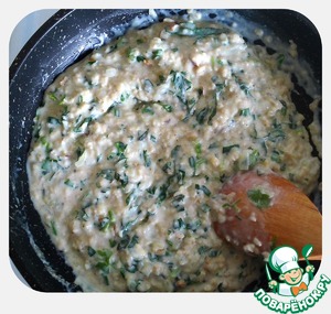 Ввести в сковороду молоко, воду, орехи, сыр.