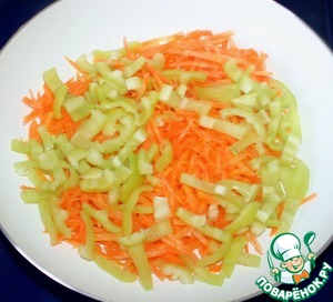 В сковороду налить немного растительного масла, добавить морковь и болгарский перец и обжарить.