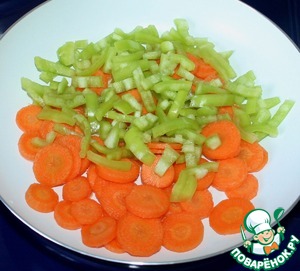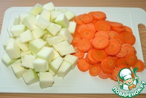 Морковь нарезать кружочками, кабачок нарезать кубиками.
