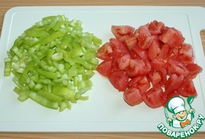 Болгарский перец мелко нарезать, помидор нарезать на небольшие кусочки.