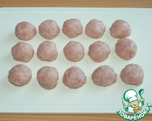 Из куриного филе сформировать шарики, размером чуть меньше, чем грецкий орех.