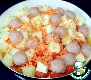 Затем добавить помидоры, кабачок, чечевицу, куриные фрикадельки и воду.