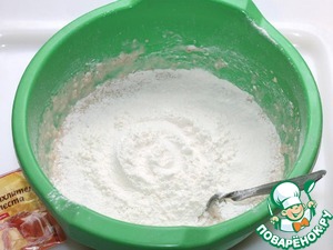 Всыпьте в смесь разрыхлитель, просеянную муку и замесите густое, липкое тесто.