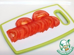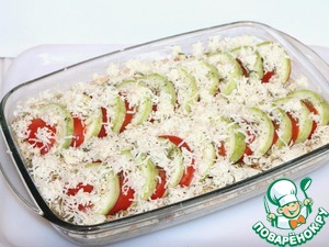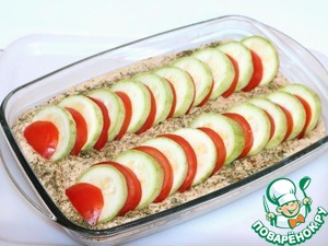 Выложите овощи в форму для выпечки, хорошо углубляя только кабачки, а помидоры прокладывать на поверхности теста между кабачками. Кладите больше кружочков кабачка, я уже потом пожалела, что мало положила.