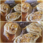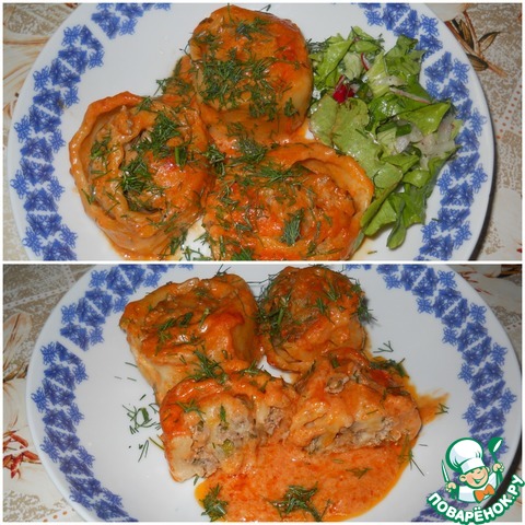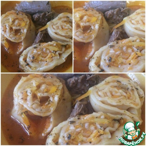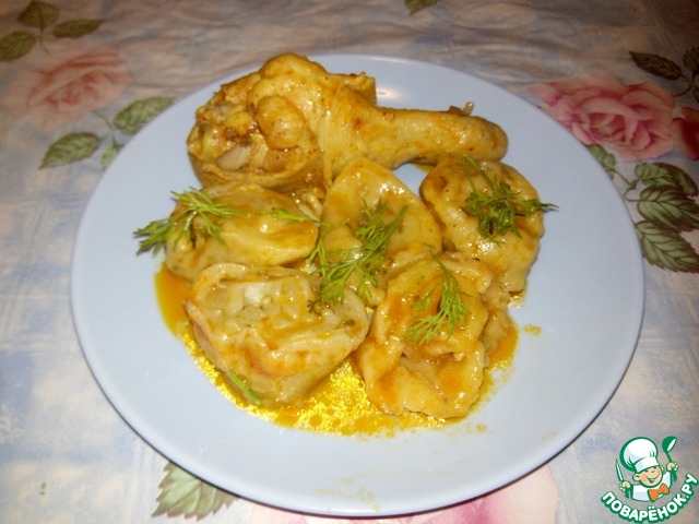 Это блюдо очень сытное и экономное, досыта можно накормить всю семью! Рулет готовится из пельменного теста и фаршируется луком, зеленью и чесноком. Все тушится с курочкой в томатном соусе. Получается просто объеденье!