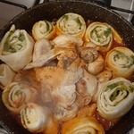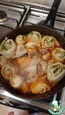 Курицу сместить на середину сковороды и по краю выложить наши рулеты.