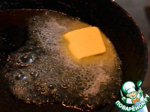 На тяжелой сковороде растапливаем 1-2 ст. ложки сливочного масла. Количество масла должно быть незначительным, лишь для придания особого привкуса мясу. Жарка в основном идет за счет вытапливания жира из самих кусочков.