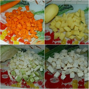 Подготовить овощи. Я взяла самые обычные и привычные для нас овощи - капусту, морковь и картофель. Все овощи помыть, почистить и нарезать кубиками (не крупными).