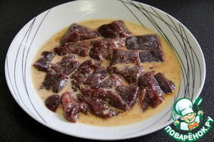 Печень нарезать ломтиками, добавить соевый соус, 1 ст. л. крахмала, разведенного небольшим колличеством воды, перемешать и оставить не 20 минут.