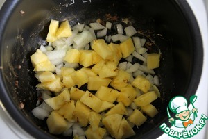 В мультиварку кладем мелко нарезанный лук и ананас, порезанный ломтиками и готовим 15 минут, иногда помешивая.