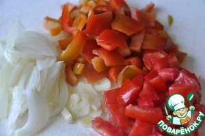 Лук нарезаем тонкими полосками, чеснок пластинками, болгарский перец кубиками.