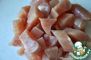 Куриное филе нарезаем кубиками (1 на 1 см).