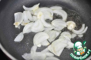 Берём сковороду, на оливковом масле обжариваем лук и чеснок 1 минуту при помешивании.
