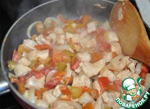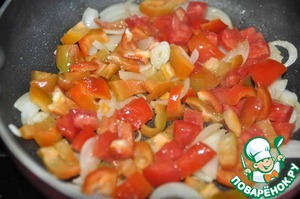 Кладём порезанные перец и помидор и жарим 2 минуты.