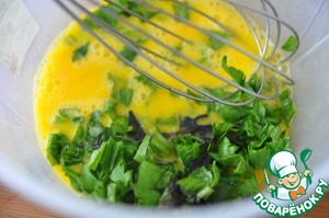 Шпинат, рукколу и базилик моем, обсушиваем бумажным полотенцем, режем и добавляем к взбитым яйцам, перемешиваем.