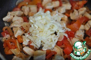 К содержимому на сковороде добавляем натёртый козий сыр.