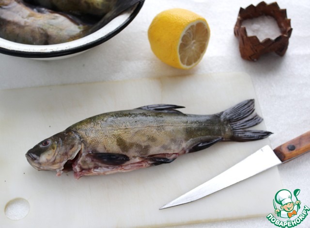 Сбрызнуть лимонным соком, посолить снаружи и внутри, отставить миску с рыбой. -