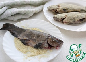 Линь, рыба своеобразная, ооочень скользкая и покрыта нежнейшей чешуей. Чистить её НЕ НАДО. Рыбу вымыть и провести ножом от головы к хвосту, чтобы убрать слизь. Выпотрошить, удалить жабры.