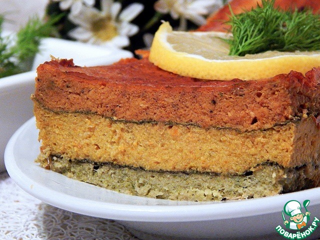 Слой второй. Соедините вторую треть филе рыбы, 1 ст. л. соевого соуса Киккоман, 1/3 лука, варёную морковь (можно сырую), яйцо, ломтик хлеба, смоченный водой или молоком, чёрный перец молотый.