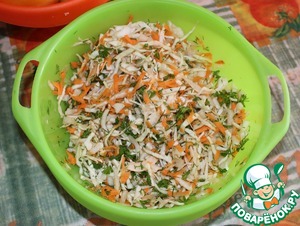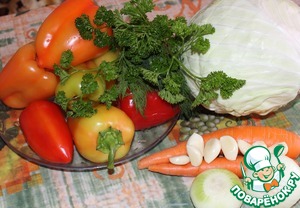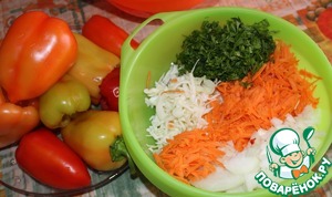 У перца удаляем сердцевину, капусту мелко шинкуем, морковку натираем на крупной тёрке, лук, зелень-режем...