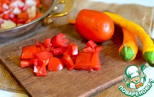 Помидоры, лук нарезать кубиками. Перец чили тонкими полосками.