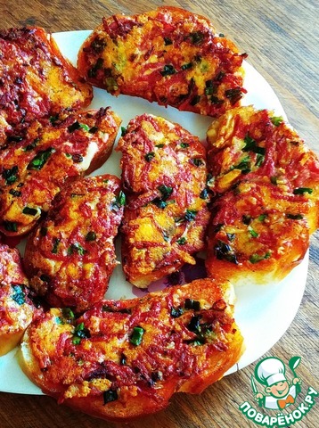... берем кусочки хлеба, сверху смазываем кетчупом и кладем столовую ложку начинки, и выкладываем начинкой вниз на раскаленную сковороду с растительным маслом. Как только начинка прихватиться снимаем...