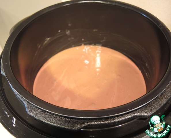 Чашу мультиварки смазываем сливочным маслом и выливаем в нее тесто. Ставим на "Выпечку" на 50 минут. После окончания основной программы, можно подержать на подогреве 10-15 минут.