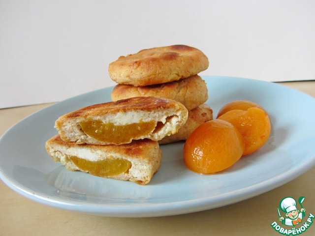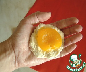 Достаем тесто из холодильника и мокрыми руками формируем сырник: на нижнюю лепешку укладываем половинку абрикоса, закрываем второй лепешкой и защипываем.