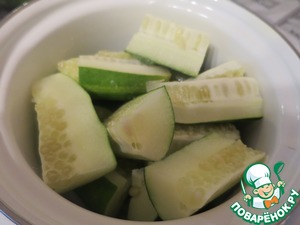 Огурцы помыть, нарезать на четыре части. Сложить в миску, посолить, оставить на 15 минут (чтобы выделился сок).