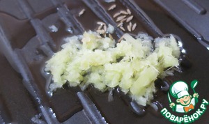 На сковороде разогреть растительное масло, добавить корень имбиря, чеснок (или асафетиду), перец чили, кумин. Чуть обжарить. -