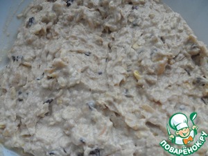 Смешать Геркулес ТМ «Мистраль» с медом, сметаной, творогом, яйцом, ванилью, разрыхлителем, тертым яблоком, корицей и изюмом.