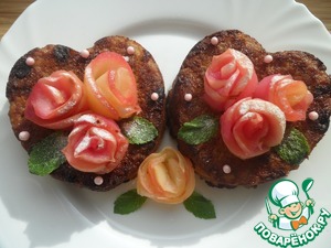 Очень полезный завтрак, в нем полностью отсутствует мука, масло и сахар. Основной компонент- овсяные хлопья, которые зарядят энергией на весь день в тандеме с медом, творогом и яблоком. А романтическая подача в виде сердечек, украшенных розами растопят сердце любого мужчины.