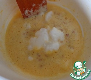Отделяем желтки от белков. Желтки взболтать вилкой. Затем добавить молоко и взбить миксером (1 минута). Добавляем муку и перемешиваем.