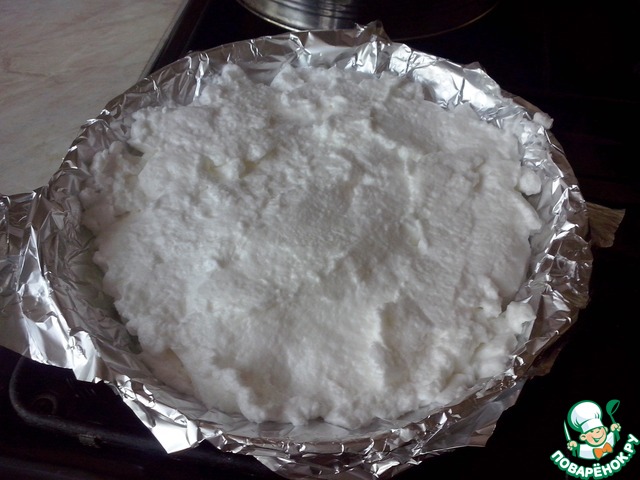 Взбиваем 2 охлаждённых белка со 100 гр. сахара в густую пену. Выкладываем на застелённую фальгой форму и выпекаем в холодной духовке на самом слабом огне не менее 2часов.