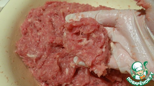 Добавить все специи к фаршу и мешать тщательно, постепенно добавляя пиво до поглащения всех свободной влаги и получения липкой консистенции фарша;