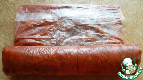 Подогнув сначала края пленки, свернуть фарш рулетом;