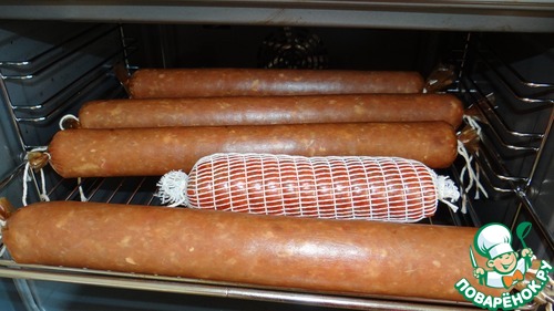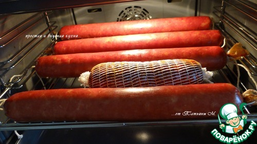 Уложить колбасу и рулет на решетку противня, в одну из колбас воткнуть температурный датчик;