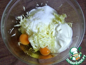 Цуккини или кабачок (без семенной части) очистить и натереть на мелкой тёрке (если выделяется сильно много сока, то лучше - отжать!).