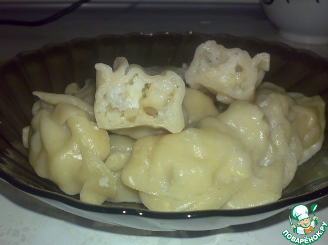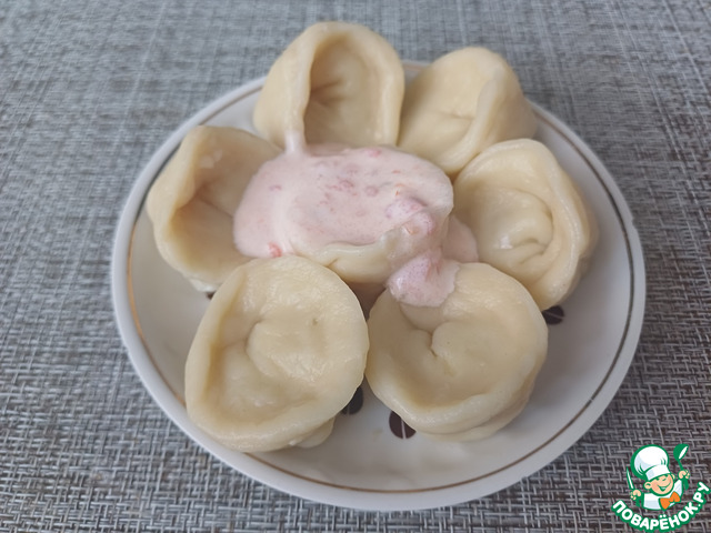 Раскатать тесто тонким пластом и вырезать кружочки рюмкой или тонким стаканом. В центр кружочка положить немного фарша и слепить пельмень.