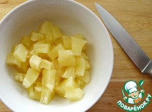 1. Ананас нарезать кубиками, отложить несколько штук для сервировки.