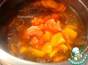 Добавить к моркови с чесноком грибы, отвар и варить 10 минут.