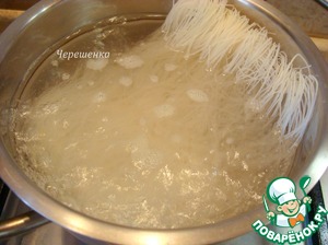 Рисовую лапшу отварить в соответствии с инструкцией на упаковке. Промыть холодной водой.