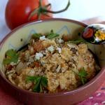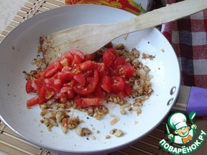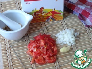 Тем временем очистим помидоры от кожицы (предварительно опустив их в кипяток, затем в холодную воду), нарежем кубиками, измельчим лук и корень имбиря (примерно 1 см). Имбирь можно пропустить через чесночный пресс. Истолчем в ступе орехи (не до пыли)))