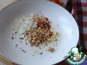 Затем добавляем орехи, лук, имбирь, соль, перец и тушим пару мнут.