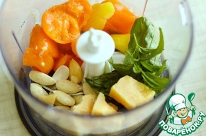 4. Миндаль, подсушить на сухой сковороде, смешать с помидорами, сыром, базиликом и мятой, маслом, солью и измельчить.