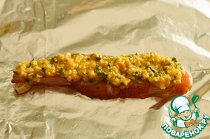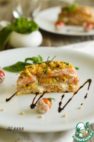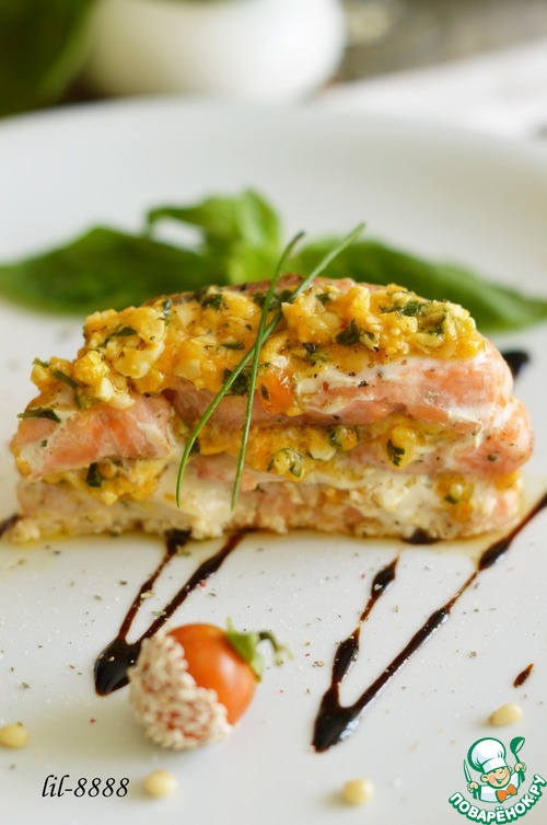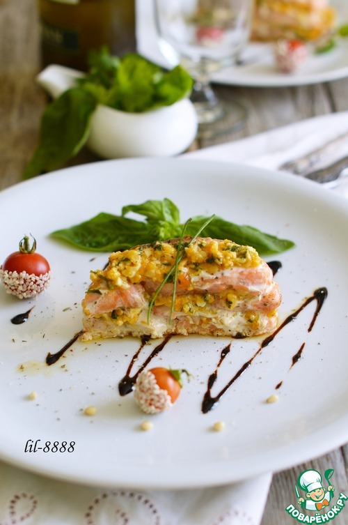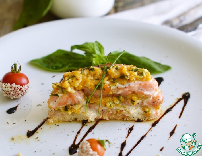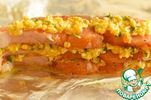 5. Противень застелить фольгой. На фольгу выложить пластинки рыбы, сверху выложить часть соуса, затем опять пластинки рыбы и снова соус. Сверху еще пластинки рыбы и немного соуса. Так у нас получится 2 пирамидки по три слоя.