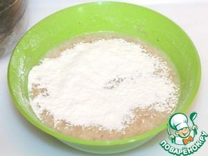 Добавляем просеянную муку и разрыхлитель. Хорошенько взбиваем.