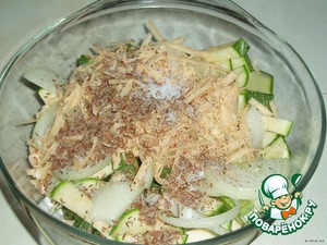 Посыпать кабачки сыром с сухарями.