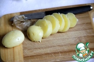 Заранее отваренный картофель очистить и нарезать кружочками по 1,5-2 см.